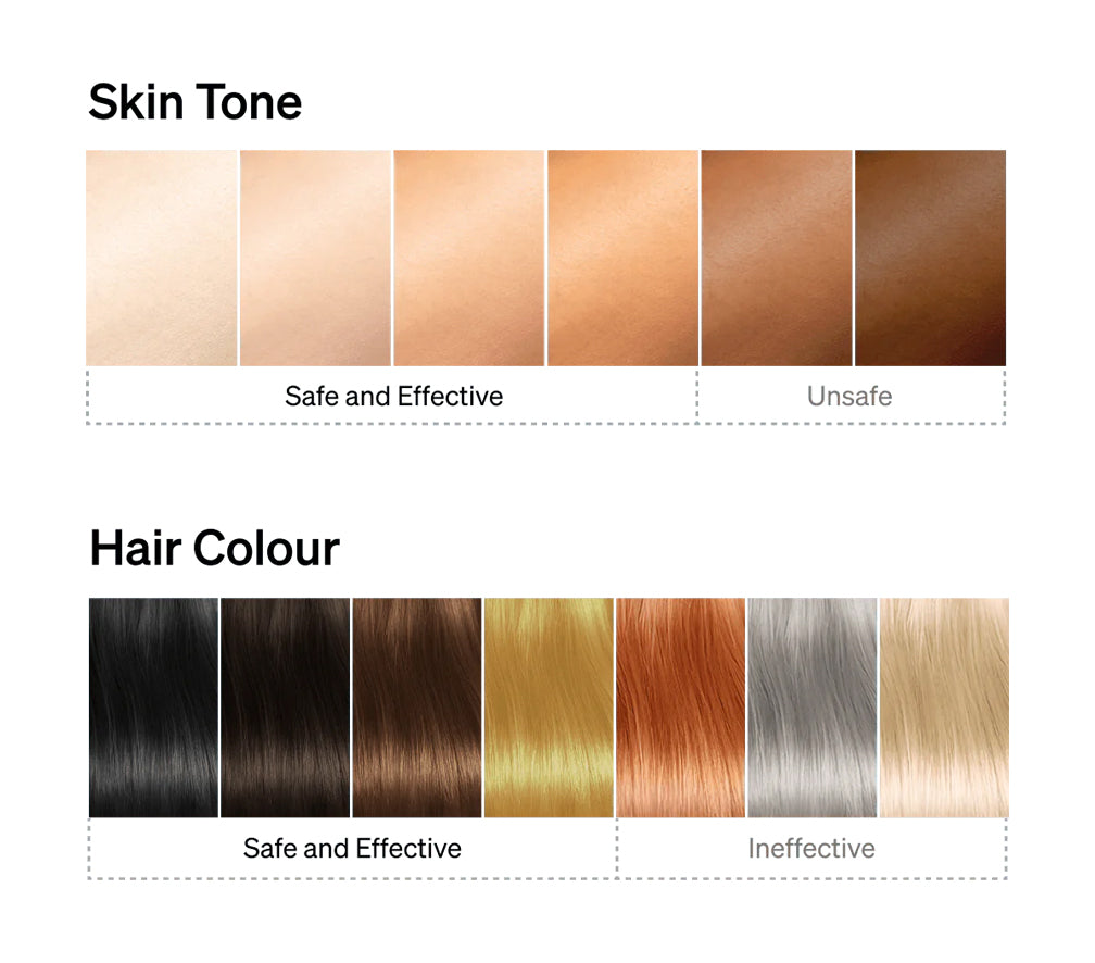 Below is a chart showing the skin tones which are safe and effective as well as hair colour. The unsafe and ineffective tone and colours are highlighted.